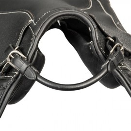 Sécurité renforcée grâce à son siège semi-creux et à son boudin arrière permettant un bon placement du cavalier. Le pommeau ne comprend pas de boudin avant, libérant le cavalier de toute obstruction limitant son mouvement lors du saut. Les quartiers, taquets et avancées améliorent la fixité de la jambe, notamment le taquet arrière. Taquets avant et arrière sur les avancées de quartier. Mono-quartier avec sanglage bas. L'arcade avant et les matelassures ont été redessinées pour mieux libérer le garrot et la colonne vertébrale des poneys.
